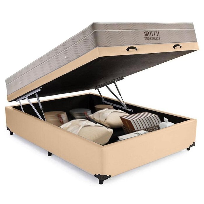 Cama Box Baú Casal Sintético + Colchão Ortobom Airtech Molas Ensacadas 138x188x65 Bege