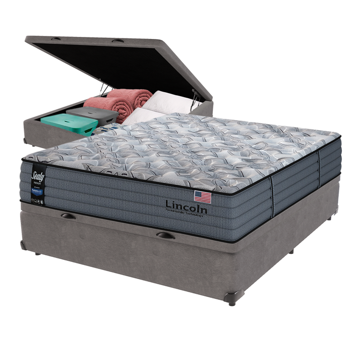 Cama Box Baú Cinza e Colchão Casal Lincoln Molas Ensacadas Sealy