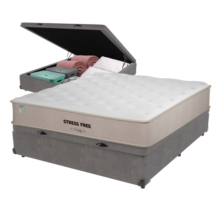 Cama Box Baú Cinza e Colchão Casal Stress Free Espuma D28 Unique