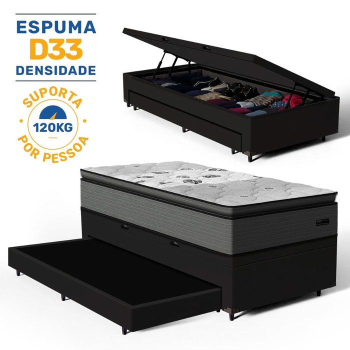 Cama Box Baú com Colchão de Espuma D33 Pillow Top Resistence + Auxiliar Unique Solteiro 88cm