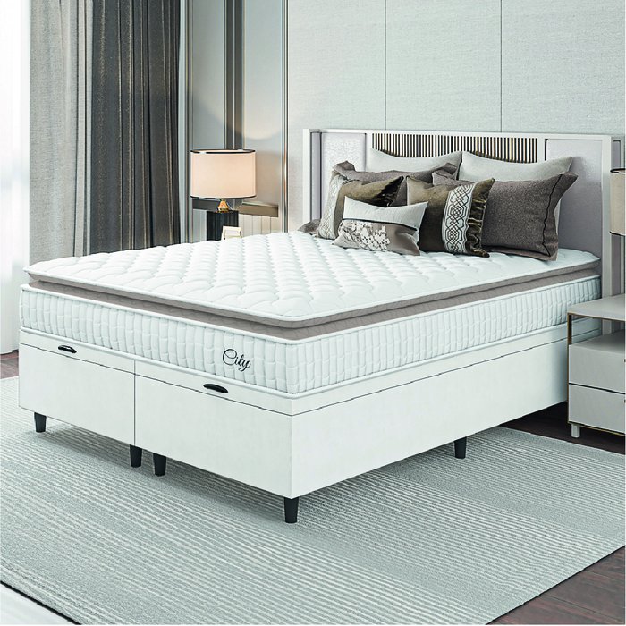 Cama Box Colchão Baú Casal King Molas Ensacadas City Pillow Top 193x203x64cm Linho Branco / Bege Branco