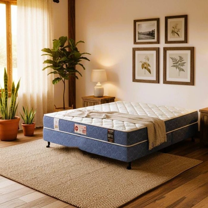 Cama Castor King Sleep Max Double Face D45 193x203x52 + Box Castor A linha Sleep Max , da Castor, é ideal para quem gosta de um colchão Firme e de Espumas, pois possui espuma desenvolvida com matéria prima importada de 1ª linha. Estabilidade e conforto definem, além do design exclusivo e inovador.Para ficar ainda melhor, o Sleep Max é Double Face - ou seja, você pode utilizar os dois lados do colchão, prolongando muito mais a vida útil do seu Castor.Todos os colchões da Castor possuem Certificado Laboratório Castor, selo ISO 9001 e PRO ESPUMA , que garante os mais altos padrões de qualidade em nossos produtos, através das normas técnicas de padrão de qualidade. DescriçãoGARANTIA DO PRODUTO- 24 meses na espuma- 90 dias no tecido ESTRUTURA INTERNAEspuma:- Lamina de espuma D45 ESTRUTURA EXTERNAFaixa lateral do colchão:- Tecido 100% Poliéster- Tecido Matelassado Tampão superior e inferior- Tecido 100% Poliéster- 02 Espuma de poliuretano D20- Bordado tipo - Continuo - Gold- Acabamento com Debrum - Fitas que reforçam todo seu acabamento e suas bordas laterais. Ficha técnica Tecnologia- EspumaTratamento- Double FaceBiotipos (por pessoa)- Até 150KgTamanho- KingMedida- 193x203Altura- 25cmPillow Top- Sem Pilow TopConforto- FirmeTecido -PoliésterDensidade- D-45Cor- Azul