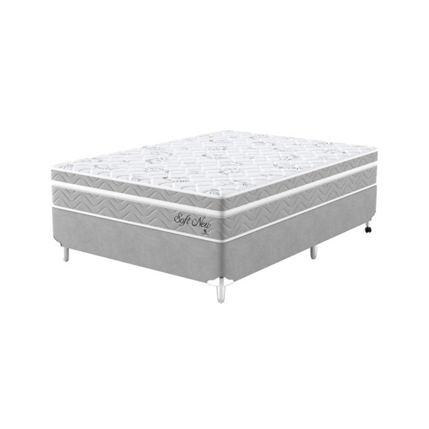 Colchão com Estrutura interna composta de molas ensacadas individualmente, Espuma poliuretano densidade 28kg/m3, EPS - Poliestireno Expandido, feltro resinado e TNT 100g. Faixa lateral no tecido Suede e tampo na malha 180g, fundo do produto TNT 100g. Cor da faixa lateral Cinza, Tampo branco com estampa e fundo preto. Box com madeira pinus e eucalipito, revestido com tecido Suede cor cinza na faixa lateral, TNT 70g preto na parte de cima e na parte de baixo.
