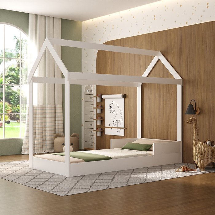 Cama C/ Telhado Montessoriana Casinha Infantil Solteiro em Mdf