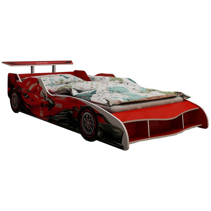 Ideal para os quartos dos meninos que gostam de aventura a Cama Carro F1 090 - Gelius Móveis conta com um desing inovador e autêntico. No modelo de um carro de corrida, possui arte impressa em suas peças, além de nichos na parte frontal.