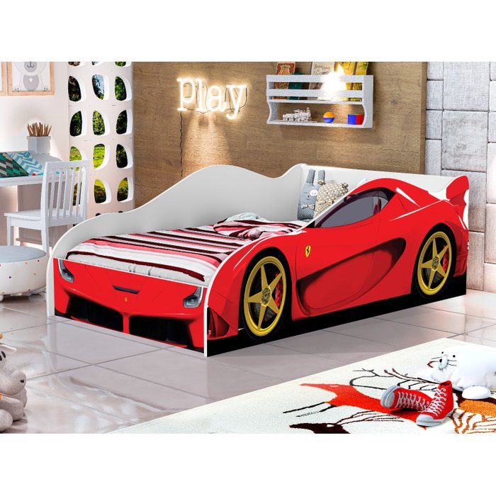 Cama Carro Solteiro Infantil Meninos Adesivada Personagens Mdf com Colchão- Av:ferrari