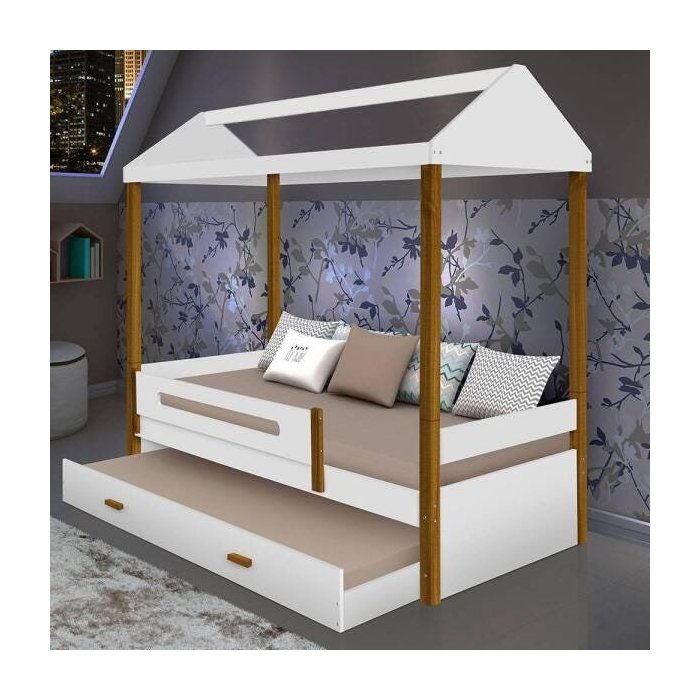Cama casa montessoriana com auxiliar Sara Branco e Mel Solteiro