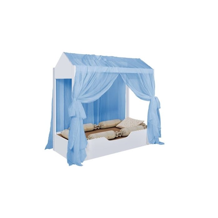 Cama Casa Montessoriana Duda Branco com Voal Azul com colchão