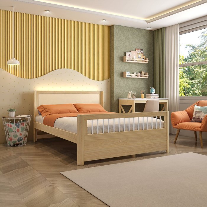 Cama Casal Wave Juvenil Reversivel em Rattan com Led Casatema MadeiraOriginals