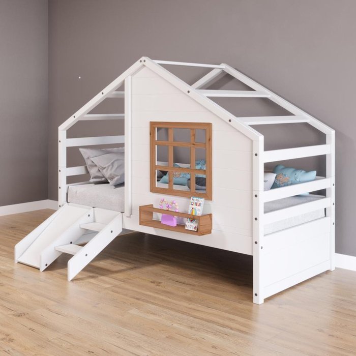 Cama Casinha com Janela com Escada/escorregador Madeira Maciça Branco/ Amêndoa Housin