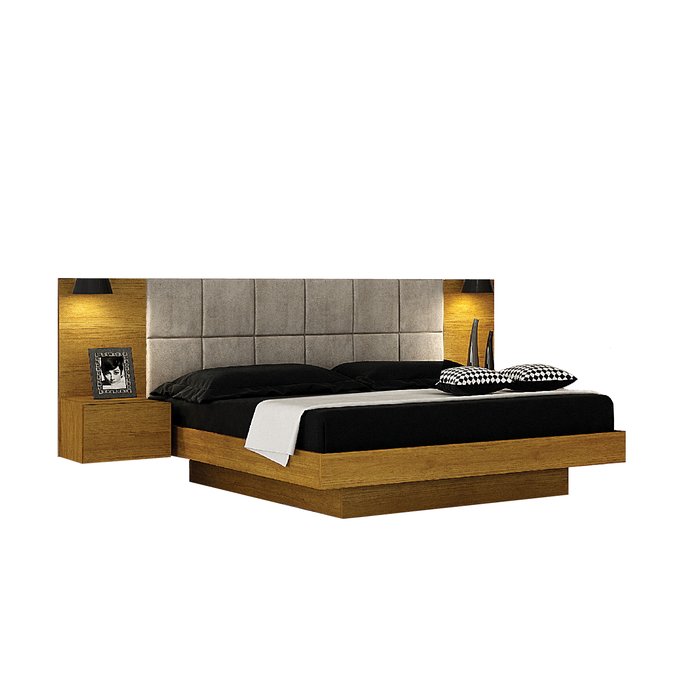 Cama de Casal Queen Size Braga com Mesa de Cabeceira e Painel Almofadado Joli Camurça Leifer Moveis