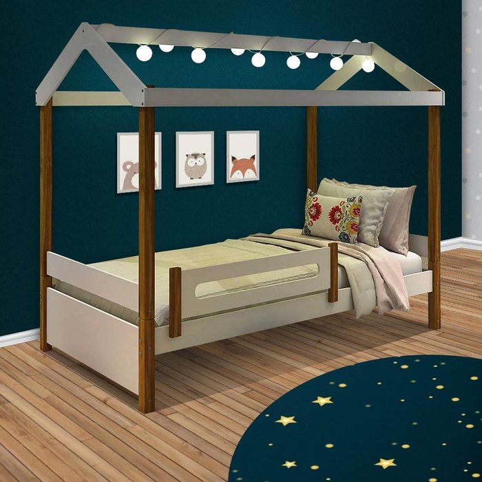 Cama De Casinha Montessoriano Infantil Com Led Eliz Branco Mel Divaloto