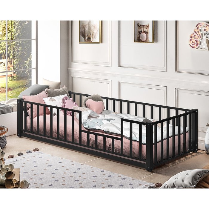 Cama de Criança Montessoriana Infantil Solteiro em Aço com Grades Ferro - Preta