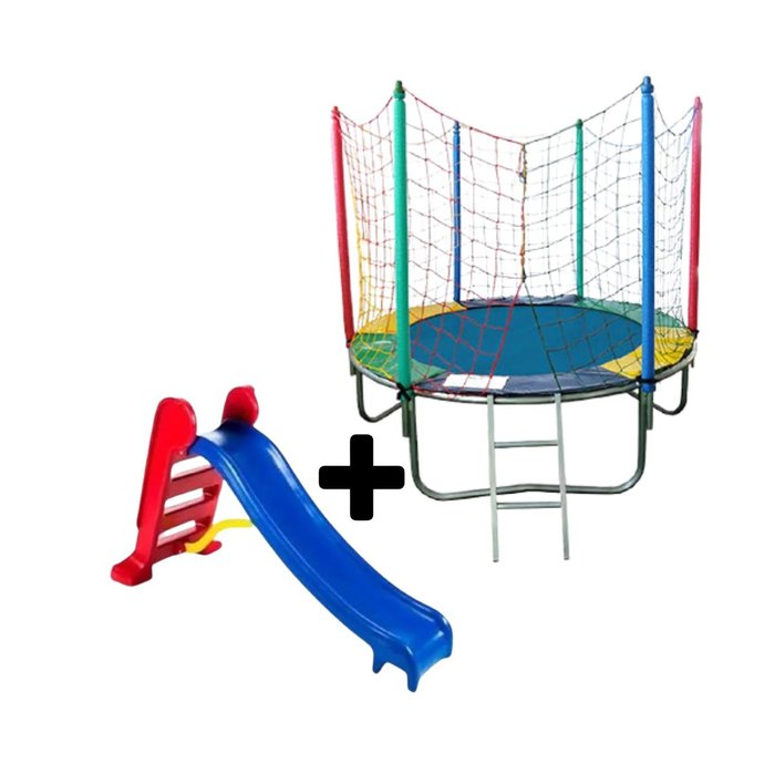 Cama Elástica (Pula-pula) Medidas: 1,83m - Redonda ESPECIFICAÇÕES: - Estrutura em aço galvanizado, não enferruja nem descasca.; - Sistema de impulsão por 30 molas; - 3 pés inteiros em “U”; - Rede de proteção em polipropileno multicolorida; - Sistema de montagem do trampolim por encaixe (fácil de montar); - Suporta até 60 kg; - Altura total: 1,68m - Lona de salto; (A cor varia de acordo com a disponibilidade do estoque, não é possível escolher a cor da lona); Garantia de 3 meses conta defeito de fabricação, Imagem meramente ilustrativa. Escorregador Infantil Médio Escorregador com rampa mais larga e a altura dos protetores laterais no topo da rampa impedem que a criança caia para os lados. Resistentes ao sol e à chuva. Para limpá-los basta um pano com água e sabão e pronto. ESPECIFICAÇÕES: Medidas P.: (C) 1,55m x (L) 62cm x (A) 98cm