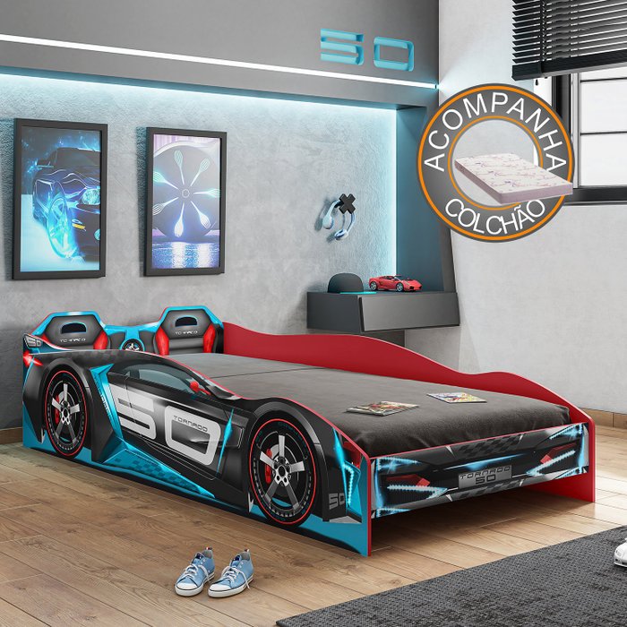 Cama Infantil Carro Tornado Plus Preto Azul Pura Magia + Colchão Ortobom