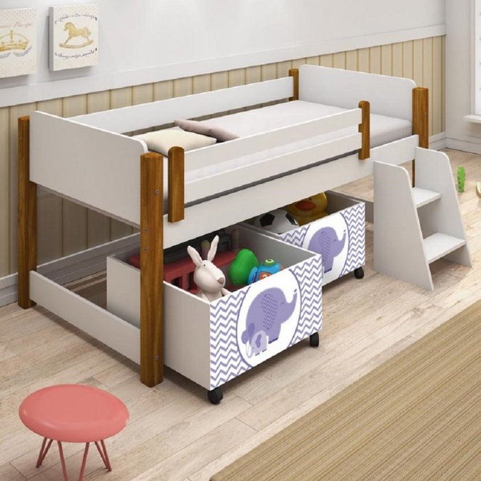 Cama Infantil Elevada 2 Baús com Rodízios Escadinha Naty
