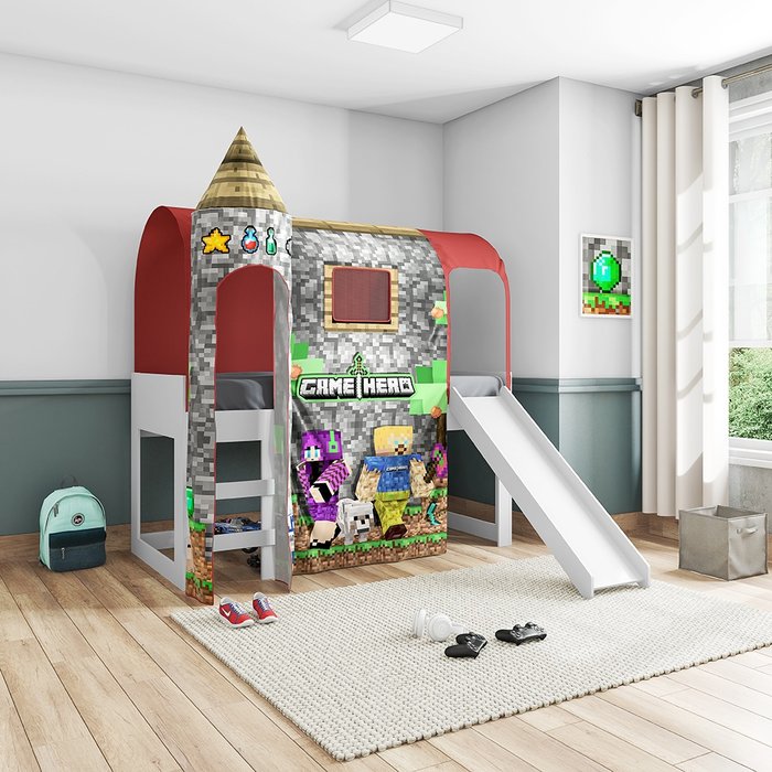 Cama Infantil Joy com Escorregador Dossel Barraca Mine Hero e 01 Torre Branco Vermelho Pura Magia +