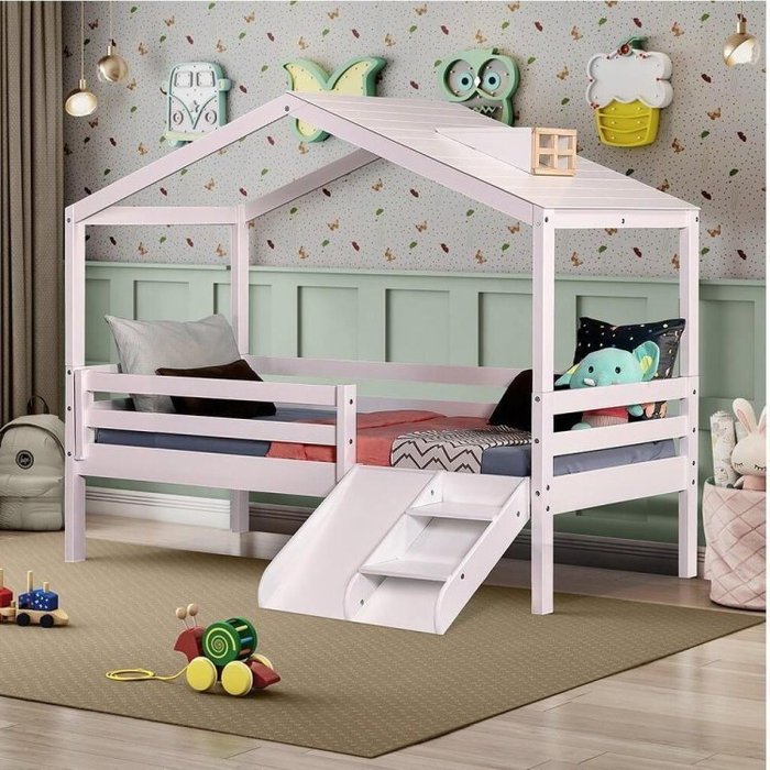 Cama Infantil Prime com Telhado Claraboia e Kit Escadinha Casatema MadeiraOriginals Branca com detalhes em natural