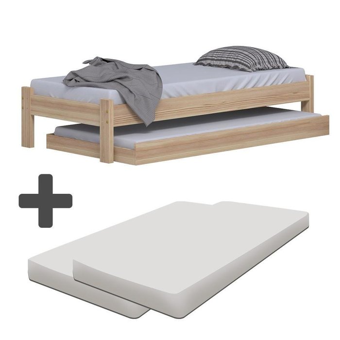 Cama Japonesa Solteiro Madeira Maciça Crua com Auxiliar e 2 Colchões Nemargi Crua