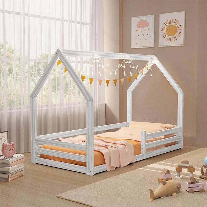 Dê asas à imaginação com a nossa cama estilo montessoriano! Produzida em madeira maciça proveniente de reflorestamento, essa cama encantadora possui um telhado em formato de casinha, trazendo um toque de magia ao quarto das crianças. Com a grade lateral completa em um dos lados e meia grade lateral no outro, garantimos a segurança e tranquilidade necessárias para noites de sono serenas. E o melhor, já acompanha o colchão!Uma cama montessoriana é um tipo de cama baixa, rente ao chão, projetada para promover autonomia e independência em crianças, incentivando a exploração do ambiente de forma segura, facilitando o acesso e a liberdade de movimento durante o sono e o despertar.- Estrutura em madeira maciça- Cama tamanho solteiro, perfeita para a criança utilizar por muito tempo- Design em formato de casinha, que mexe com a imaginação das crianças- Acompanha colchão tamanho padrão solteiro (88 x 188 cm)Dimensões da cama: Largura 94 cm; Altura 127 cm; Profundidade 196 cmDimensões do colchão: Largura 88 cm; Altura 12 cm; Profundidade 188 cmItens Inclusos: 1 cama solteiro e 1 colchão solteiroComplexidade da montagem: Fácil, pode ser montado por apenas uma pessoa e/ou necessite de maior conhecimento para montagem.Recomendações de uso, manutenção e limpeza: Limpar com flanela ou pano macio seco, não utilizar produtos abrasivos, desengordurantes, álcool ou solvente. Não expor o produto diretamente a luz solar e à umidade.Garantia: 3 mesesOBS: Foto meramente ilustrativa, objetos, utensílios e decoração não fazem parte do produto.