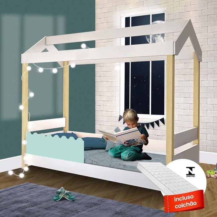 Cama Montessoriana Infantil Montessoriana Solteiro com Led e Colchão Branco Menta Divaloto