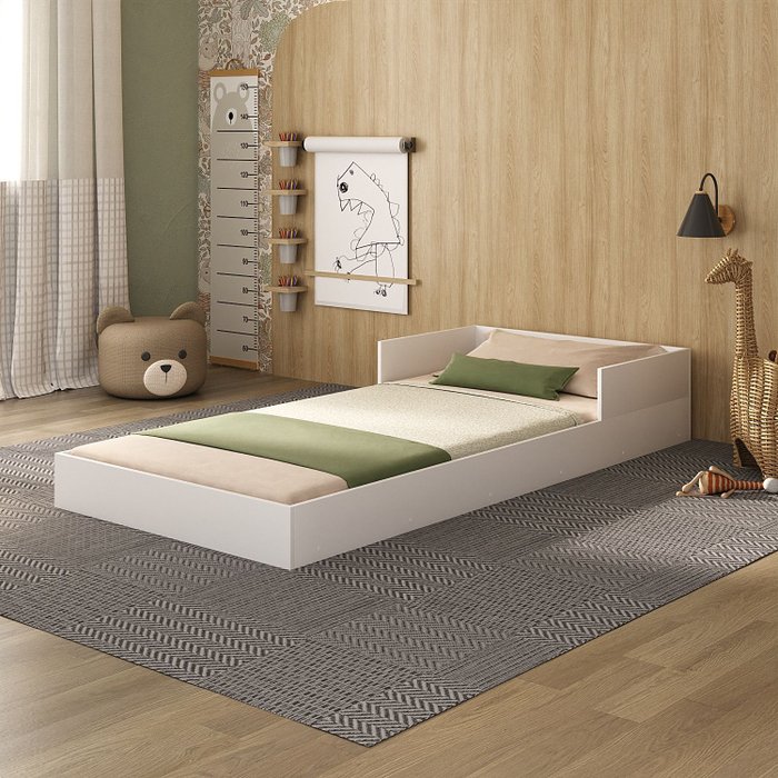 CAMA MONTESSORIANA SOLTEIRO ELIANE Transforme o quarto do seu filho em um espaço seguro, confortável e cheio de estilo com a Cama Infantil Montessori solteiro com Grade de Proteção. Inspirada no método Montessori, essa cama foi projetada para incentivar a autonomia e o desenvolvimento infantil, permitindo que seu filho explore o ambiente de forma independente e segura.Estrutura Montessori: Altura apropriada que permite que a criança suba e desça da cama com facilidade, promovendo a independência desde cedo.Dimensões:100% MDF.Largura: 91 cmComprimento:196 cmAltura: 31 cmIdeal para colchão:188x88 cmSuporta até 100kgObs: Não acompanha colchão