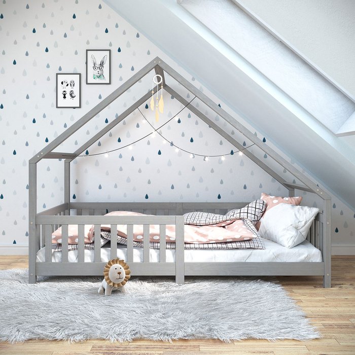 Cama Montessoriana Madeira Maciça Casa com Estrado Cora Cinza