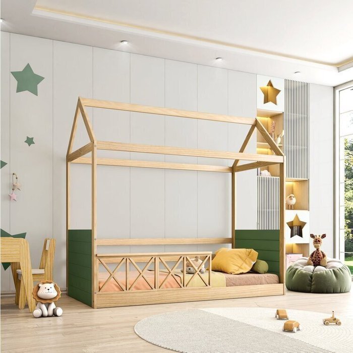 Cama Montessoriano Casinha Garden com Grade Dupla Casatema MadeiraOriginals Verde/Natural