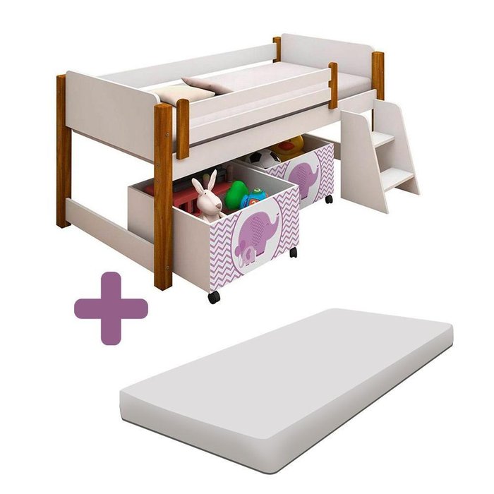 Cama Para Criança Com 2 Baús Elefante Rosa Filhote E Colchão Solteiro Branco E Mel Naty