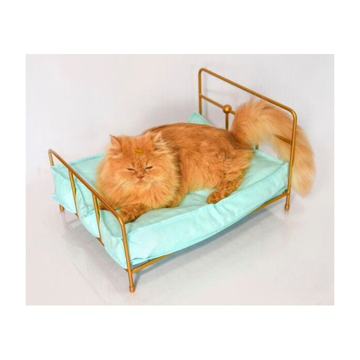 Cama em metal maciço 8mm, pintura epoxi dourada, tamanho 45x60 cm, colchão em fibra com capa fixa de TNT, capa colchão em tecido à escolher com zíper.
