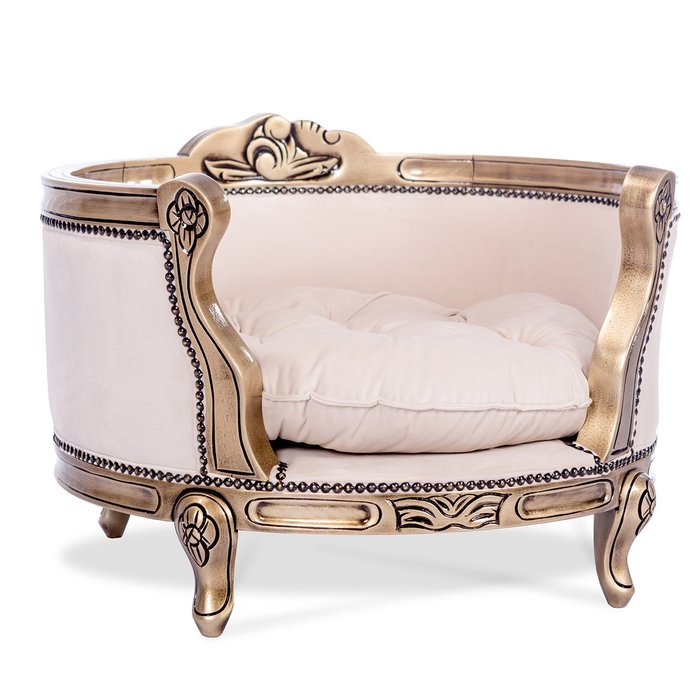 Cama Pet Clássica Entalhada de Luxo Tachada Dourado Envelhecido e Veludo Rosê Dourado Envelhecido