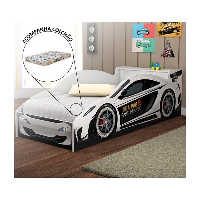 Cama Quarto Carro Infantil Baú com Colchão Grade de Proteção Branco
