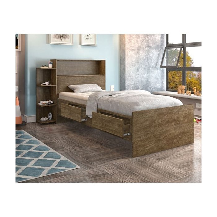 Cama Quarto Solteiro Isa Com Baú Prateleira e Gaveta Castanho