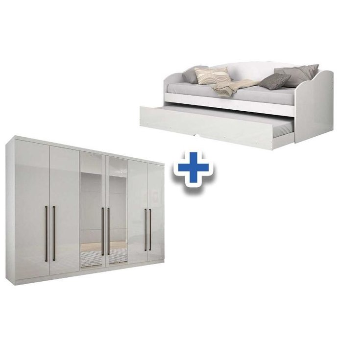 Cama Sofá Funny II c/ Auxiliar + 2 Colchões Orthocrin + Guarda Roupa Bari Branco