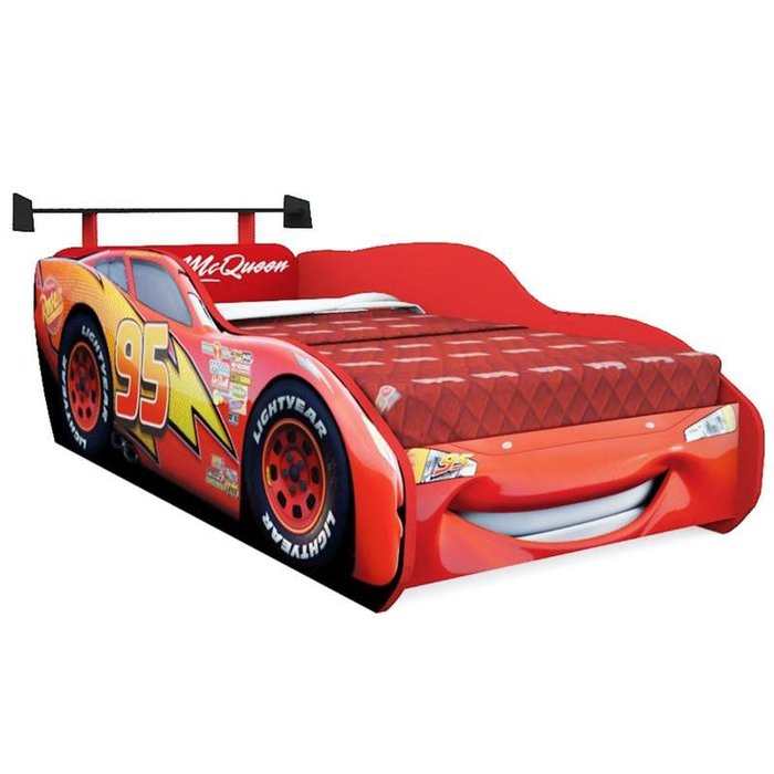 Cama Solteiro Carros Star com Aerofólio, estrutura em MDF de qualidade, estrado reforçado para suportar até 120 kg, no formato de carro Relâmpago McQueen, com aerofólio, produto da marca Pura Magia.