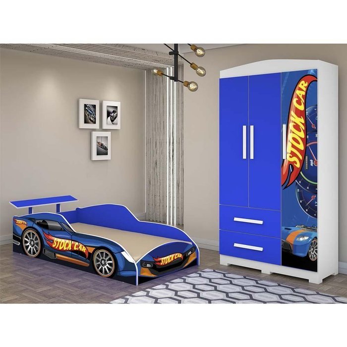 Cama Solteiro Com Guarda Roupa Carro Stock Car Azul Marinho