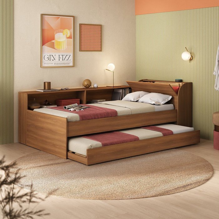 Cama Solteiro com Nicho e Cama Auxiliar Aria Nogal