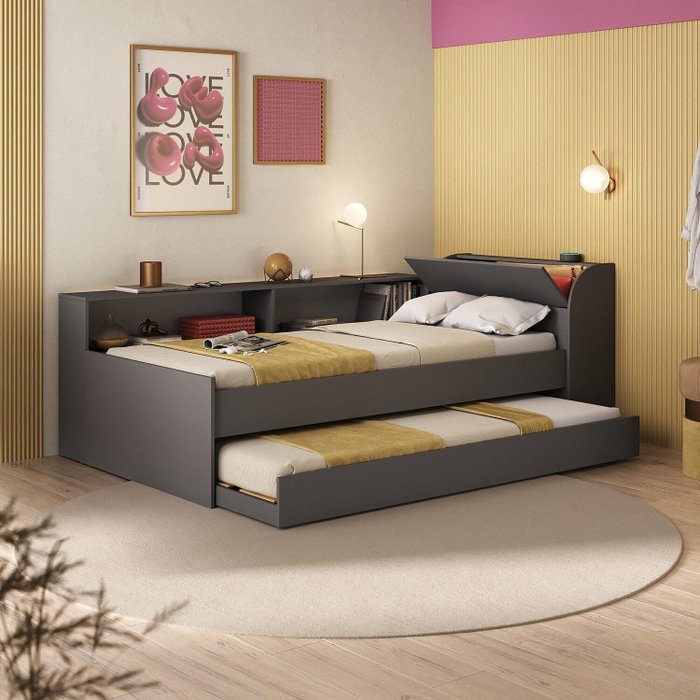 Cama Solteiro com Nicho e Cama Auxiliar Aria Grafite