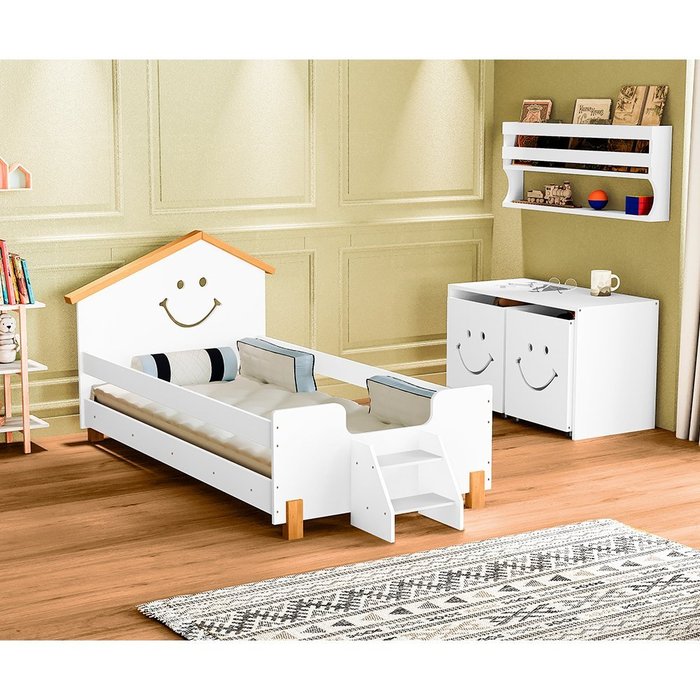 Cama possui design Montessoriano, onde a cama fica na altura da criança, garantindo maior autonomia e auxiliando também em seu desenvolvimento. Além disso, é feita em MDF acompanhada de grades de proteção, escadinha e cabeceira em forma de casinha.