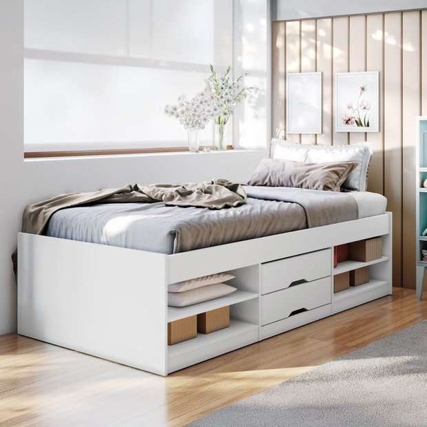 As duas gavetas com corrediças metálicas proporcionam um amplo espaço de armazenamento para guardar roupas de cama, livros, objetos de decoração e tudo o que você precisar, mantendo tudo organizado e de fácil acesso. Os nichos adicionais são ideais para exibir seus itens decorativos favoritos, dando um toque personalizado ao seu quarto.