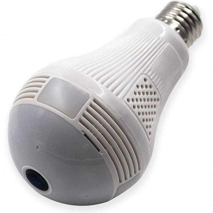 Lâmpada LED com Camera 360º WIFI App próprio (V380S) para iPhone e Android A instalação é muito simples, basta rosquea-la como uma câmera comum. (necessita rede wifi ao alcance) A imagem pode ser vista ao vivo em seu SmartPhone App IPC360 É possível acender a luz remotamente através da internet, conversar com quem esta na sala (voce ouve tudo o que esta sendo falado onde esta a câmera e também é possível falar no seu smartphone e o som sai no auto falante da câmera) DESCRIÇÃO: - Esta camera possui a tecnologia mais avançada atualmente para monitorar e cuidar de sua casa ou seu trabalho. - Ideal para utilizar em casa monitorar crianças, idosos, animais. - E também no trabalho para monitorar seu escritório, funcionários veículos. - Sistema Extretamente simples de instalar, basta colocar em um bocal de lâmpada comum; - Tem o tamanho e formato de uma lâmpada de led comum, discreto; - Conecta-se a sua rede wifi e a partir daí você pode visualizar e interagir de qualquer lugar do mundo atarvés do seu celular ou tablet; - Se alguém entra no ambiente você receberá uma mensagem em seu telefone e poderá visualizar / interagir com a pessoa; - Aplicativo para Android e IOS; - Possui microfone para ouvir o som ambiente e auto falante para você poder falar com as pessoas no ambiente; - Você pode gravar ou fotografar a qualquer momento em seu telefone ou tablet; - Usando cartão SD a câmera vai gravando continuamente Características: Câmera Ip 360 graus panorâmica, 1.3Megapixel 1280x960P alta definição, lente olho de peixe, com aplicativo de controle e visualização pelo telefone móvel com IOS ou Android. Controle de luminosidade através do celular, 2 vias de áudio (pode falar e ouvir, através da lâmpada),