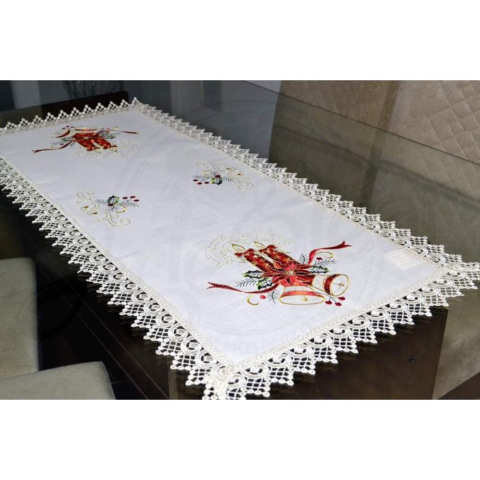 Caminho de mesa em tecido poliéster, na cor palha, com lindos bordados de velas e sinos natalinos, nas cores vermelho, dourado e verde, acabamento em renda guipir em toda lateral do caminho.