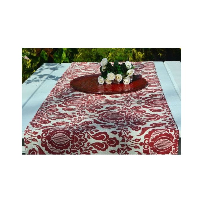 Caminho de Mesa Branco Jacquard Estampado com Arabescos Vermelhos Camille