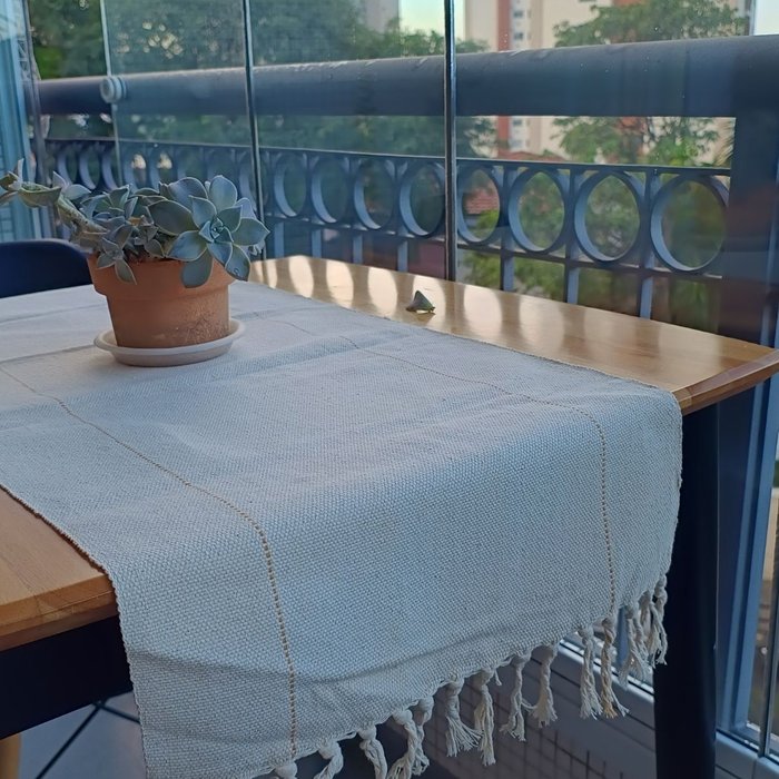 Cor: Cru natural com linhas caramelo Tecido: 100% algodão Tamanho: 45 x 180 cm Número de peças: 1 unidade Modelo: Artesanal em tear manual