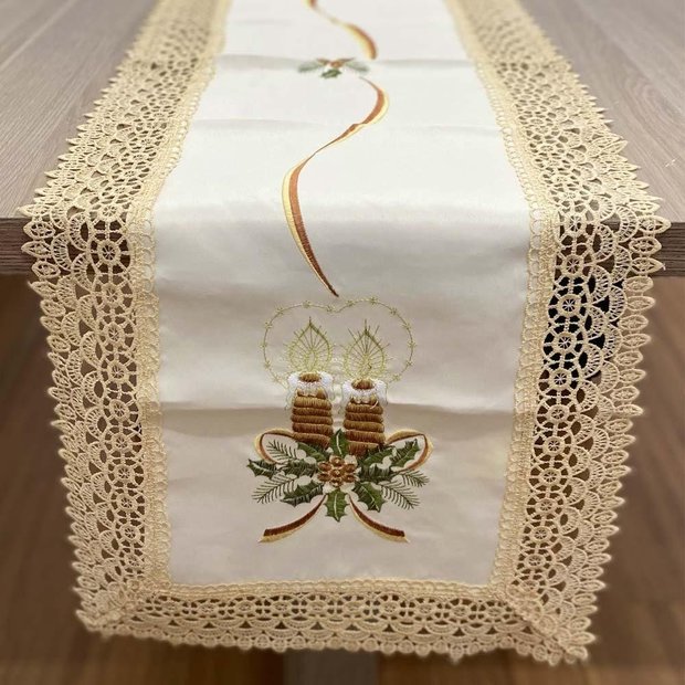 Confeccionado em tecido 100% poliéster, fio escovado. O trilho de mesa 101 Natal Rafimex com acabamento bordado creme com motivos natalinos centralizado e ao longo de toda a barra. Centro de mesa é ideal para decorar com beleza e requinte e tornar sua mesa mais harmoniosa. Tudo para deixar a sua mesa mais bonita na época de natal! Foto meramente ilustrativa. Contém: