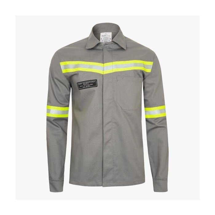 Camisa de segurança, confeccionada em uma camada de tecido Uniforte Pro FR, composto por 100% de algodão, ATPV 11 Cal/cm², fabricado pela empresa Companhia de Tecidos Santanense, com gramatura nominal de 8,0 oz/yd² (271 g/m²).