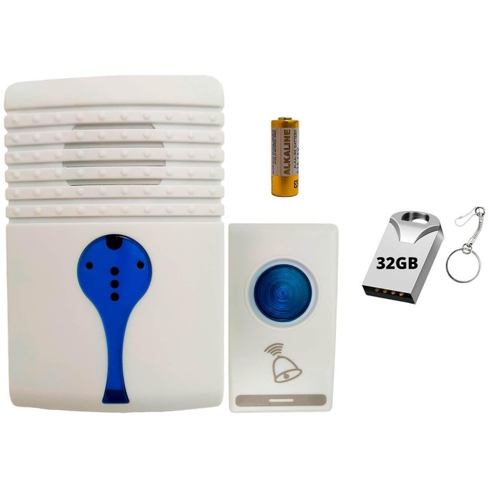 Kit com Campainha Sem Fio e Mini Pendrive 32Gb. Conheça os produtos: