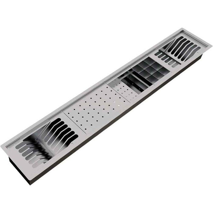 Tenha um escorredor de pratos, copos e talheres acoplado na bancada da cozinha. Proporciona melhor aproveitamento de sua bancada, criando novos espaços em sua cozinha; Possibilidade de escolha de diferentes acessórios deslizantes que se movimentam pelo canal,