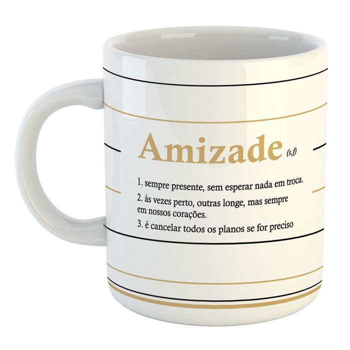 Que coleção é essa Significar em palavras um sentimento tão lindo como AMIZADE, CANECA feita em cerâmica e o mais bacana é produzido no Brasil. Use sua caneca em qualquer lugar, no escritório, em casa seja para um café , um chá ou aquele chocolate quente ela sempre vai muito bem. Para lavar não usar produtos abrasivos, use o lado macio da esponja e sabão neutro. Além de linda essa caneca vai ao microondas e lava louças. Impactos podem danificar o produto.