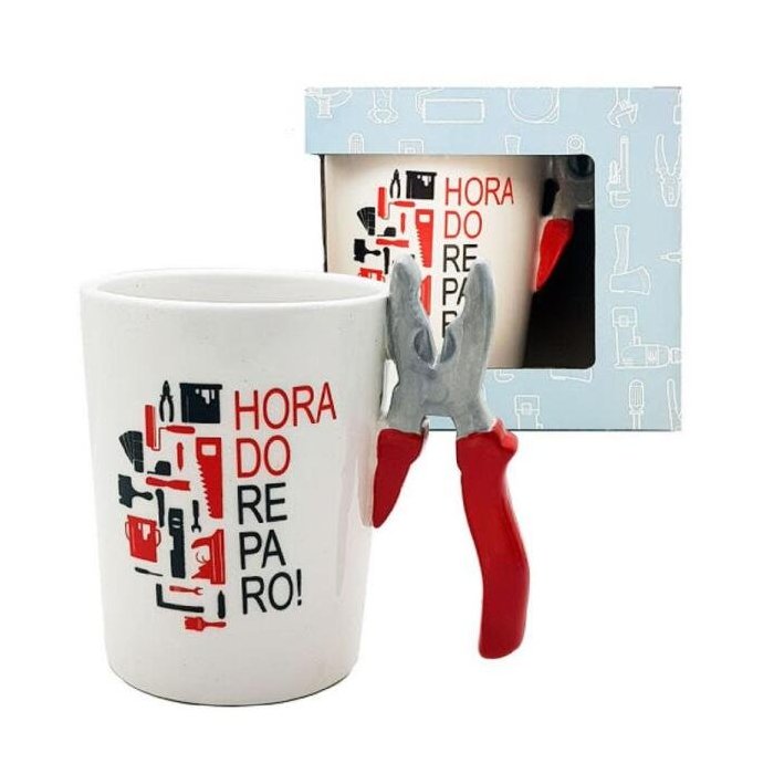 Deixe as ferramentas de lado e descanse um pouco, apreciando sua bebida favorita nessa caneca diferentona. Capacidade: 380 ml. Conteúdo da embalagem: 1 caneca alça alicate. Material: cerâmica. Dimensões: 11x13x9 cm. Cor: Branca.